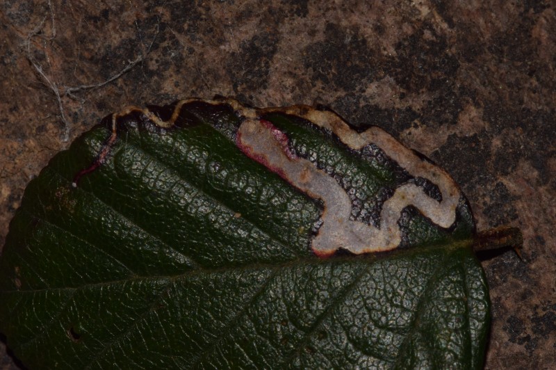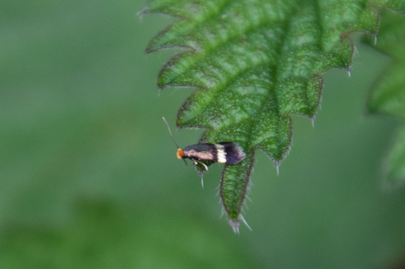 Importante zone basale argentée, bande blanche doublée vers l'intérieur d'une bande plus sombre, mines sur Rubus : tout concorde avec Stigmella aurella.