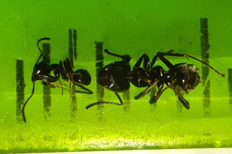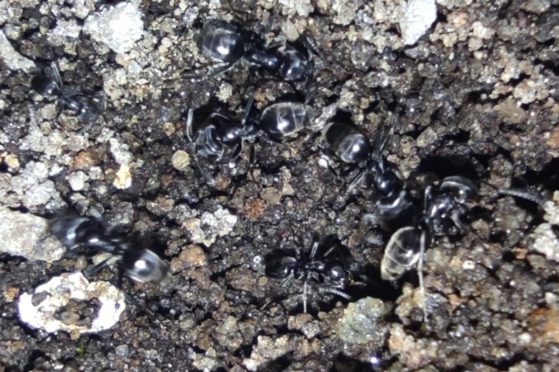 Remarque : Tapinoma du complexe nigerrimum, et je suppose qu'il s'agit de T. darioi étant donné qu'elle a déjà été découverte dans les pots d'oliviers séculaires de la pépinière, en compagnie des autres bêtes sur lesquelles je suis tombé [cf. Nouvelles observations des fourmis invasives du complexe Tapinoma gr. nigerrimum dans le Massif Armoricain (Hymenoptera : Formicidae)]. Ouvrières très nombreuses, en longues files, et très polymorphes.